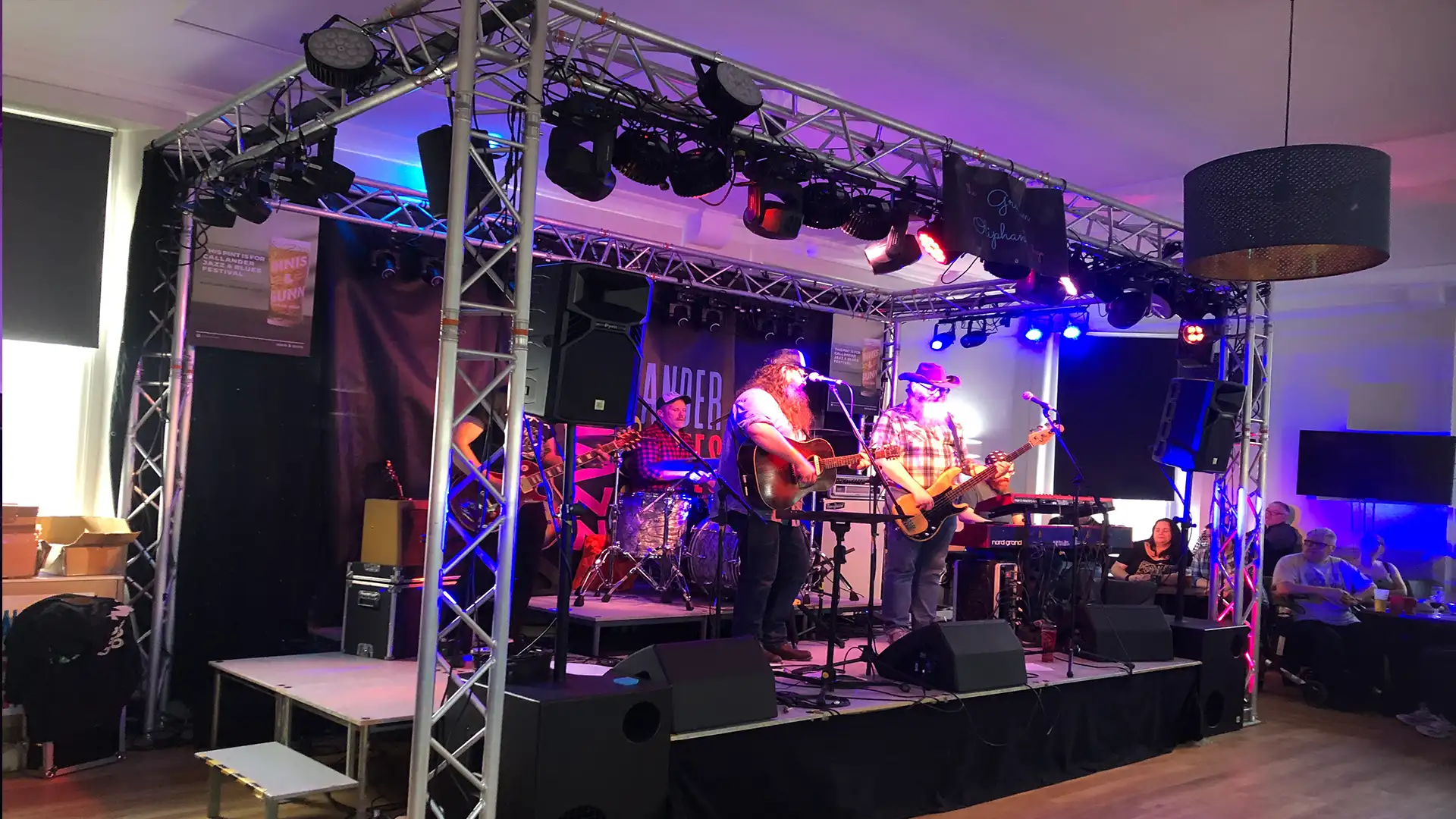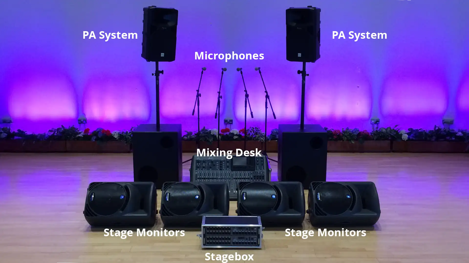 All PA systems, monitors and microphones are installed, tested and adjusted on-site for a balanced, professional mix.